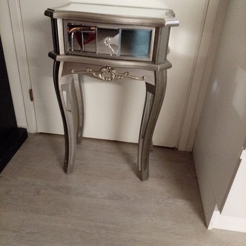 Kaksi peili yöpöytää. Runko mielestäni puuta, jossa alkuperäinen hopeanharmaa maalipinta. Toisen pöydän jalassa muutama pieni särö peilissä, muuten hyväkuntoiset. Meillä ei tupakoida, kääpiöhamsteri asuu häkissä. Laatikoissa tilaa tavaroille. Hinta yhteensä.