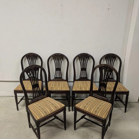 Nämä kauniit Hepplewhite tyylin tuolit etsivät uutta kotia. Tuolien liitoksissa väljyyttä ja puuosissa kolhua ja pieniä koriste puutoksia Verhoilut ehjät. Myydään settinä ja projektina. Istuinkorkeus 51 cm.