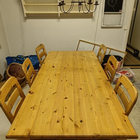 Kokopuinen ruokailuryhmä (pöytä + 6 tuolia). Kaikki ehjiä, mutta tuolien liitosten liimat kuivuneet, jonka seurauksena liitokset hieman väljät. Tuoleilla voi kuitenkin istua. Pöydän pinnassa hieman käytön jälkiä/painaumia, mutta ei erityisen huomattavia.