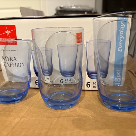 Sinisiä mukeja 5kpl ja erilaisia laseja yht 8kpl.