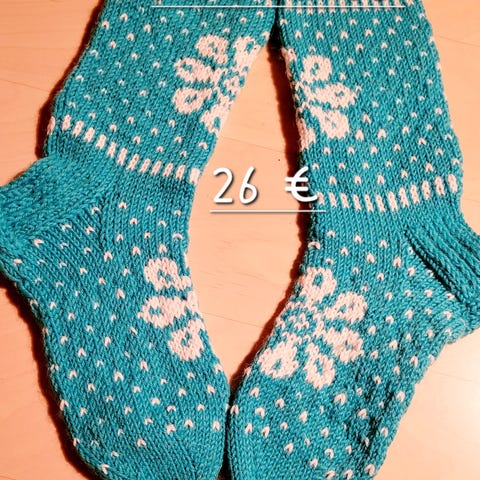 Käsintehdyt villasukat koiraihmiselle. Sukat on tehty ohuista, mutta kestävistä langoista. Ne mahtuvat hyvin talvikenkiin. Sukissa on vahvistettu kantapää.