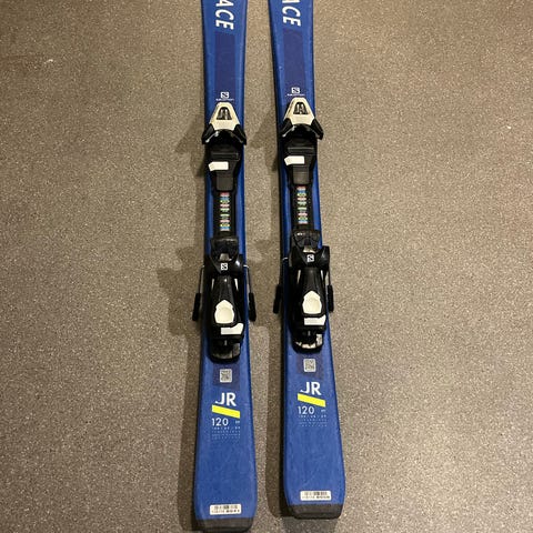 Salomon lasten sukset, pituus 120 cm. Sukset ovat väriltään valkoiset ja mustat, joissa on vaaleanpunaisia koristeita. Suksissa on Salomonin siteet valkoisilla. Vain nouto.