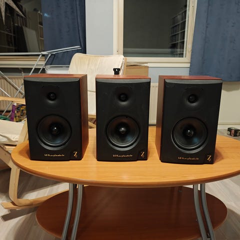 Wharfedale 10.5 Tornit. Toisen kaiuittimen alareuna turvonnut(kuvassa) ja terminaali hajalla. Pikku värkkäilyllä joku voi saada vielä toimivan parin ja hinnassa on huomioitu.