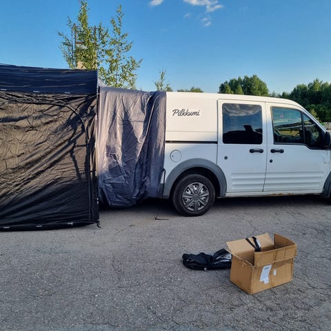 Simpukkamallinen teltta auton perään. Teltta on tilava ja helppo pystyttää sekä kiinnittää autoon. Uuden veroinen.