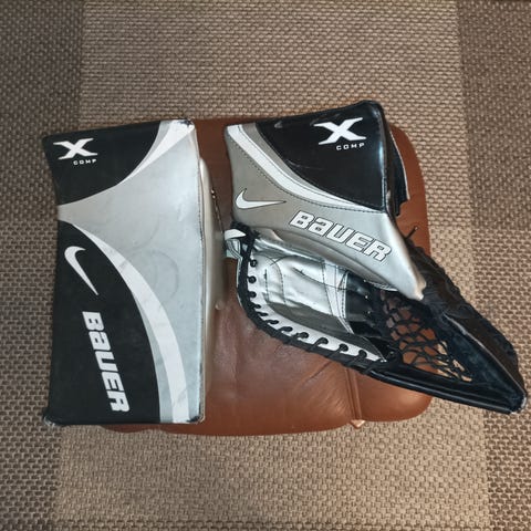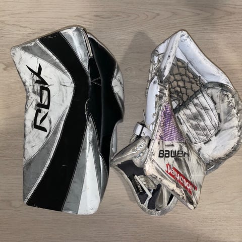 Yhden kauden käytössä ollut warriorin g6 youth räpylä ja bauerin gsx prodigy kilpi. Kiekon jälkiä piisaa mutta kaikki materiaalit, tarrat yms, sekä kilven hanska ehjiä.