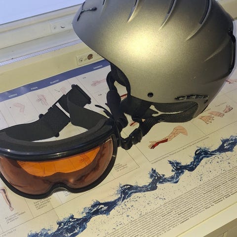 Rossignol laskettelukypärä ja cebe merkkiset lasit.