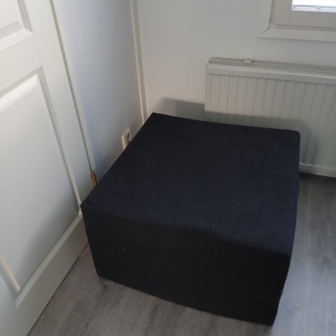 Siniseen settiin kuuluu rahi jonka mitat on kork. 33 cm, halkaisija 41 cm, tyyny (35x39 cm) ja patakinnas, pannulappu.
