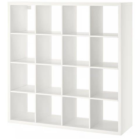 Käypä ikealainen hyllykkö vaikkapa tilanjakajaksi. Ollut lastenhuoneessa, pinnat pyyhkimällä tämä on ihan täys peli. Muutamassa kolossa ruuvinreikiä, kun niissä on ollut sarjaan kuuluvia kaappeja ja laatikostoja kiinni. Pinnassa pieni vaurio päädyssä alimman välihyllyn korkeudella, joka on tainnut tulla jo kasausvaiheessa, noi hyllyköt kun on aika höttöä sisältä.