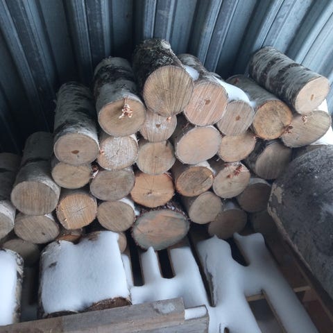Reilu 1 pinomotin verran koivua. Puut on kaadettu viime talvena. Kesän yli kuivaneet. Nyt katoksen suojissa. Metrin pituisia pölkkyjä.