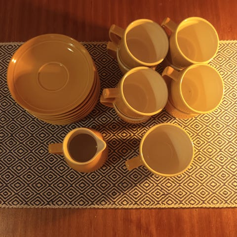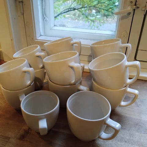 Kermansavi Oliivi astiaston valkoiset kahvi- ja teekupit sekä asetit. Kahvikuppeja 6kpl, teekuppeja 11kpl, asettilautasia 12kpl. Erittäin siistit.
