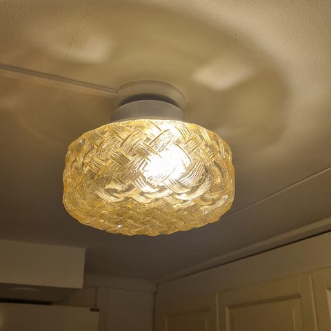 Pyöreä kattoon upotettava plafondi kattovalaisin, jossa on valkoinen kupu ja metallinen kehys. Valaisimen takaosassa on kiinnitysreiät ja sähköjohdot. Valmistajaa ei ole merkitty näkyviin, 70 lukua.Valaisin edustaa vintage-tyyliä, joka on suosittu sisustuselementti. Tyyli yhdistää vanhan ajan estetiikan ja modernin käytännöllisyyden.