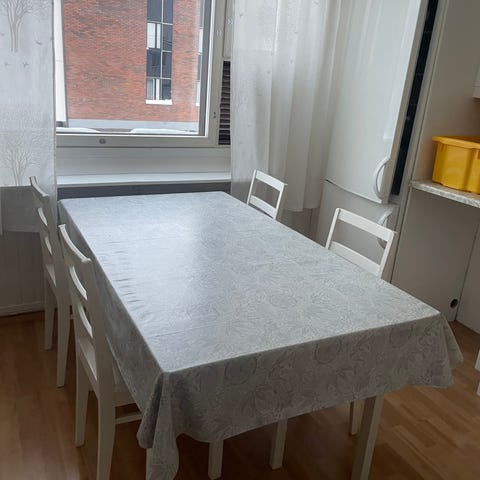 Taattua Askon laatua oleva ruokapöytä + 4 puutuolia, design syntynyt Olli Borgin kynästä vuonna 1965. Pöydän halkaisija normaalitilassa 115cm, alla 57cm jatkopala. Tuolin leveys 50cm, istuinkorkeus 45cm, kokonaiskorkeus 81cm. Pinnoissa normaalia ajan patinaa, ei kuitenkaan ruhjeita tai palapuutteita - Lisäksi rakenteellisesti kaikki ovat tukevia, sekä pöytä että tuolit. Tuolien istuinverhoilut ovat ehjät ja puhtaat. Tämä jos mikä on sitä vintagea joten jos edullisempi design kiinnostelee, otappa yhteys ja tee hyvät kaupat!