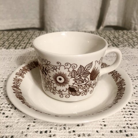 Myydään 4 käyttämätöntä, kuin uutta Arabian Finnish Flint Sirkku -sarjan kahvikuppia ja aluslautasta.