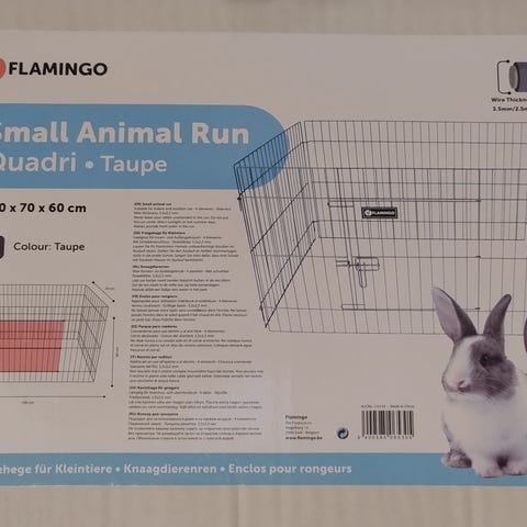 Pieneläin-aitaus: metallielementit ovella ja ruskea vedenpitävä kangaskatto.