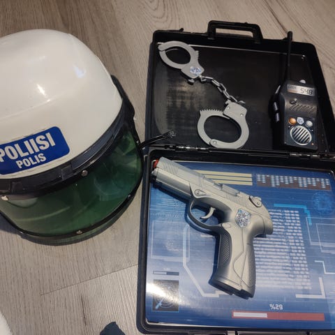 Myydään lasten poliisiasu setti. Sisältää liivin, leluaseen, leluvirkamerkin, pampun ja leluradiopuhelimen. Kunto ehjä. Toki pientä käytön jälkeä voi löytyä.