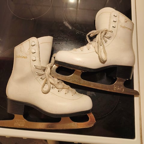 Valkoiset luistimet, en löytänyt kokomerkintää, sisämitta 20cm. Olleet käytössä 33 kenkien kanssa, teroitettu viime talvena. Terissä ei ruostetta, valkoisessa pinnassa joitan jälkiä.
