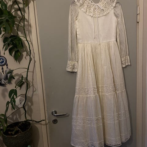 Beautiful handmade vintage dress with lace details and buttons in the back- and sleeves, fits sizes XS-S