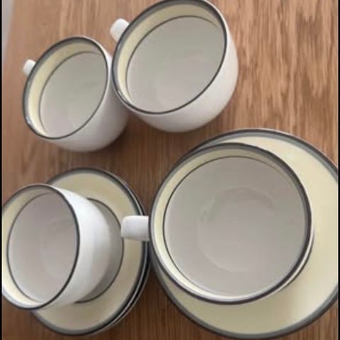 Suunnittelija: Inkeri Leivo. Astioissa on tyylikäs musta reunaviiva ja ne ovat erittäin hyvässä kunnossa – yhdessä lautasesta pieni jälki.
