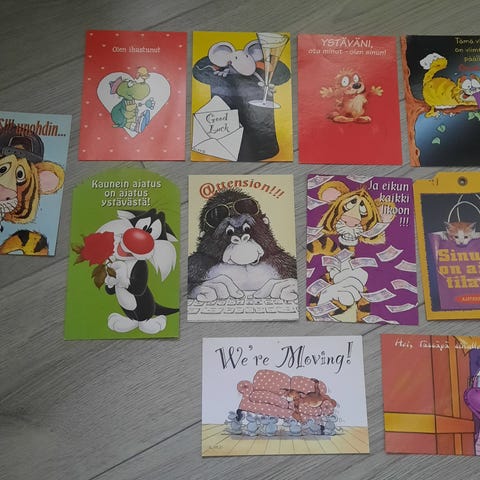Onnittelukortit lapsille, lappi aiheiset kortit ja pääsiäiskortit. Kortit käyttämättömiä ja puhtaita. Hinta 0,25€ kpl.