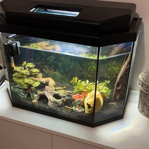 Silikonit on vaihdettu noin vuosi sitten. Mukaan tulee suodatin, lämmitin, happetin, koristeet(kuvassa kaikki) automaatti ruokinta, led valo, kalat: