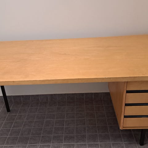 Jämäkkä, vanhempaa tuotantoa oleva kirjoituspöytä jossa mahtuu toimimaan. Varsinkin jos vedet molemmista päistä aputasot ulos, mahdut vaikka nukkumaan tämän päällä, sitä kai ne etätyöläiset joskus harrastavat? Pitkiin laatikoihin mahtuu lähes puoli omaisuutta... Mutta jos pistät nämä täyteen vaikka 200e seteleitä, voi olla että rahamäärä olisi paljon suurempi mitä koko Kaituenmäen asuinalueella on rahavaroja yhteensä! Tai sitten ei. Joka tapauksessa pöytä on isokokoinen, hyvätapainen ja pinnoiltaankin suhteellisen siisti joten potentiaalia on potenssiin kolme!