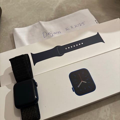 Apple Series 6 älykello, jossa on 44 mm sininen alumiinikotelo ja sininen sport-ranneke. GPS + Cellular