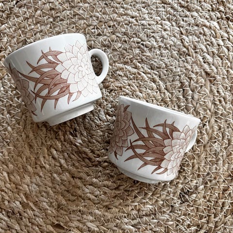 Arabia Pulmu kahvikupit 4kpl ja lautaset 4 kpl, joissa on ruskea kukkakuvio. Sarjaan kuuluu useita kuppeja ja lautasia. Materiaali posliinia. Suunnittelija Raija Uosukkinen.