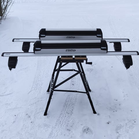 Telineeseen mahtuu neljä lumilautaa tai kuudet sukset. Kätevä tapa kuljettaa ilman suksiboksia sukset ja laudat katolla.