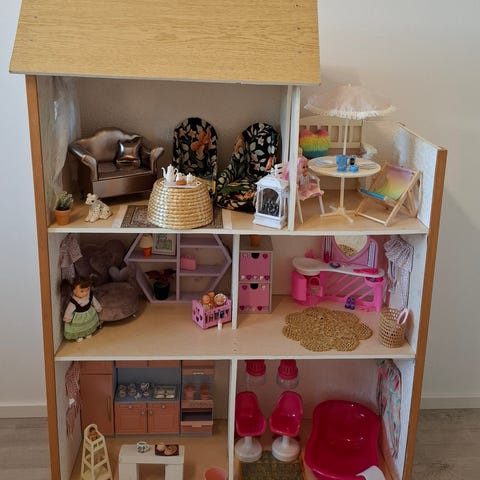 Tällä talolla on leikitty, eli käytön jälkiä on näkyvissä, mutta se on kuitenkin täysin ehjä. Lisäosa on kiinnitetty altapäin ruuveilla, eli sen saa tarvittaessa irrotettua.