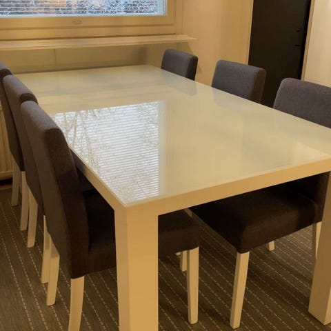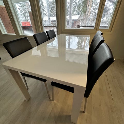 Todella siisti ja kaunis ruokailuryhmä uuteen kotiin. Pöytä Jyskistä ja tuolit maskusta. Lasikansi on erikseen teetetty pöydän mitoilla. Lasikannessa on pientä naarmua valoa vasten kun tarkasti katsoo. Pöytä todella hyväkuntoinen ja ehjä. Tuolit myös todella hyvässä kunnossa, istuin osat ehjät ja puhtaat. Pöytään saa ostettua lisäkevyn jolla pöytää saa jatkettua. Pöydän mitat L90 x P150 x K75 cm. Tuolien mitat 85x49x55cm.