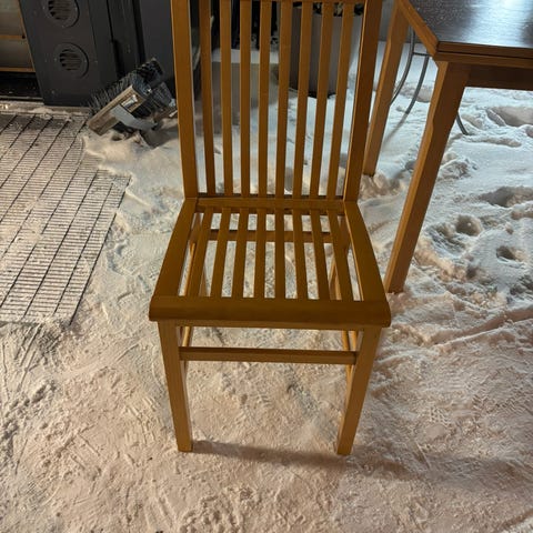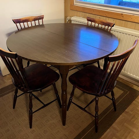 Pöydän halkaisija 110 cm, korkeus 75 cm ja jatkopala 37 cm. Kynäjalat. Suunnittelija hyvin todennäköisesti tanskalainen Kai Kristiansen. Pöydän pinta on kulunut , mutta mitään isompia syviä naarmuja ei ole. Tuolien päälliset on joskus itse uusittu > toiseksi viimeinen kuva. Tuolien hienot rottinkiset selkänojat ovat ehjät. Pöydän saa irrotettua kahteen osaan.