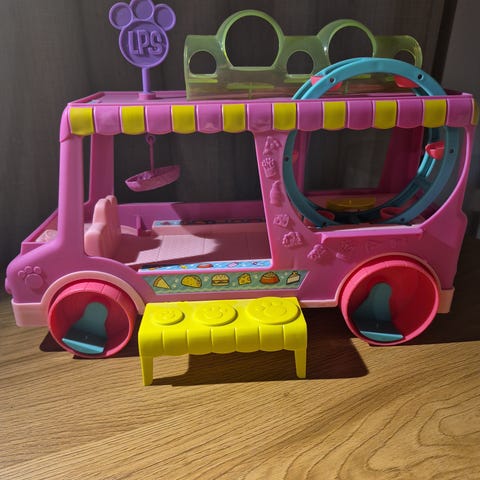 Littlest Pet Shop leikkiauto vaaleanpunainen ja turkoosi, mukana useita pieniä lemmikkieläinhahmoja ja leikkiosia. Auto avautuu ja sisältää erilaisia leikkitiloja, kuten uima-altaan ja huoneita. Materiaali muovia, soveltuu lasten leikkeihin.