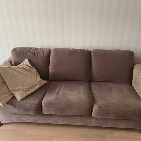 Kompakti kolmen istuttava sohva, sopii pieneenkin asuntoon. Esim. ollut minulla pienessä yksiössä. Todella hyvässä kunnossa, runko tukeva, vain hyvin pieniä käytön jälkiä puuosissa (näkyvät kuvissa). Kangas on hyvässä kunnossa, ei venynyt tai haalistunut tms.