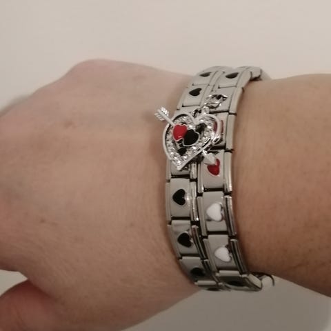Rannekorut, 19 palaa yhdessä korussa. . Kestävät, ruostumatonta terästä. Uudet, joten sopii myös lahjaksi, esim. ystävänpäiväksi. Korut ovat venyviä ja ne on helppo sujauttaa ranteeseen, sopii lapsille ja aikuisille. Niitä voi helposti pienentää tai suurentaa paloja lisäämällä tai poistamalla. Yhteensopiva Casa D'oro, nomination, charms yms. palakorujen kanssa. Paloja 19 sydänpalaa, valkoisia, punaisia ja mustia sekä roikkuva sydänpala. Toinen valkoisella sydämellä olevista paloista tehty. Pakkaan tuotteet lahjarasiaan. Yhteishintaan 25€.