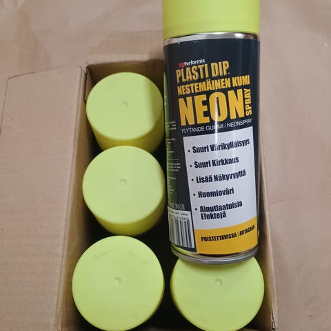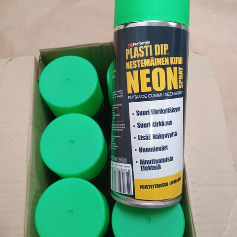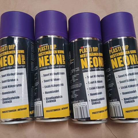 Plastidip neonsininen kumimaali. Helposti poistettavissa oleva spraymaali, joka jättää kumimaisen pinnan. Tämä ei lohkeile esimerkiksi mopon katteista tai muista muoviosista. Hyvä tuote vanteiden tuunaukseen.
