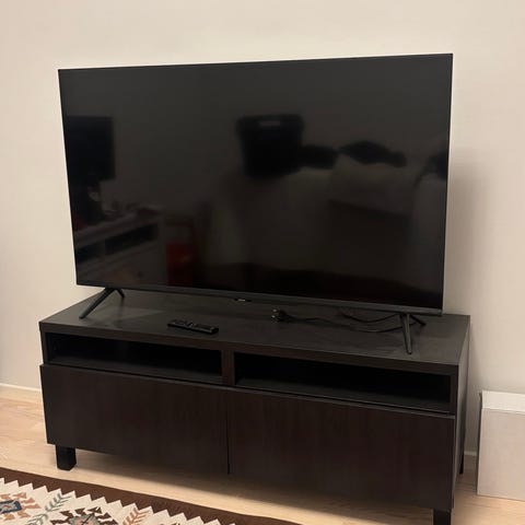 Ikean Bestå-sarjan korkeakiiltovalkoinen TV-taso. Tasossa on avausmekanismilla toimivat laatikot. Tason päällä on lasilevy, joka kuuluu kauppaan.