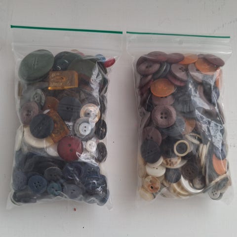 Samanlaisia ja erilaisia, samankokoisia ja erikokoisia nappeja ja neppareita menneiltä vuosikymmeniltä.