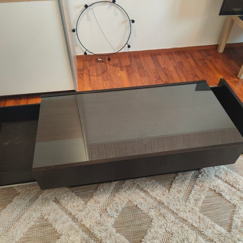 Musta sohvapöytä, rottinki yksityiskohdilla.