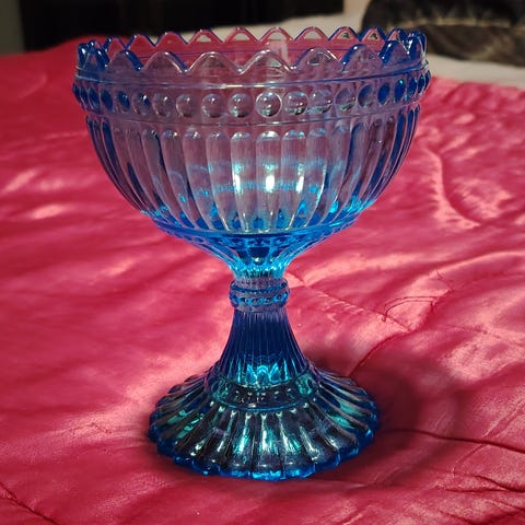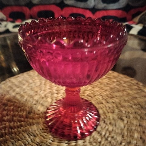 Iittala Marimekko vihreä "MARISKOOLI" lasinen jälkiruokakulho, jossa koristeellinen kuviointi ja jalallinen muotoilu.