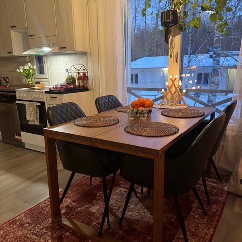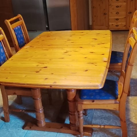 Pöytä on jatkettava ja siihen löytyy 6 tuolia. Tuolit myydään ilman päällisiä! Halutessasi saat päälliset 6kpl 50€