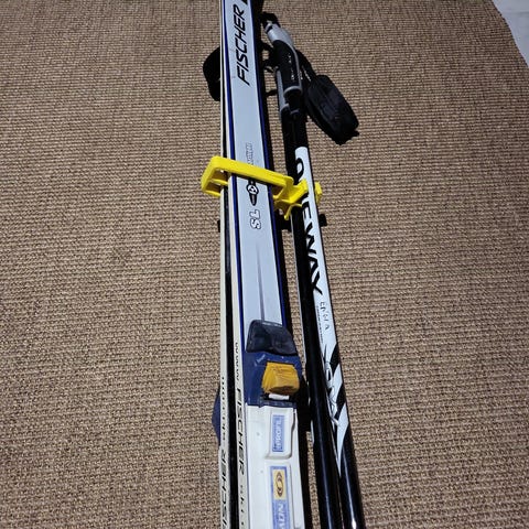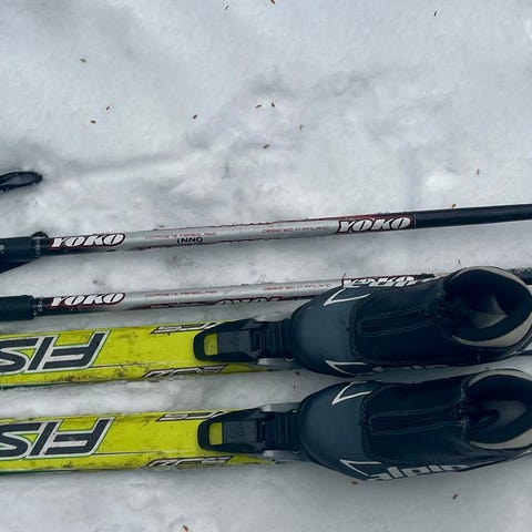 Lasten Fischer sukset. Mukana hiihtosauvat. Salomon hiihtokengät sinisellä ja keltaisella värityksellä, koko 33. Välineet soveltuvat perinteiseen hiihtoon.
