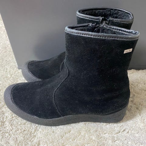 Mustat kengät, joissa lämmin vuori ja vetoketju sivussa helpottamassa jalkaan laittoa. Ulkopohja on kuvioitu pitävyyttä varten.