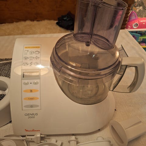 Moulinex Genius 2000 monitoimikone, joka sisältää useita lisäosia ja ominaisuuksia monipuoliseen ruoanlaittoon ja valmistukseen. Laite on suunniteltu erilaisiin keittiön tarpeisiin kuten sekoittamiseen, vatkaamiseen ja pilkkomiseen.