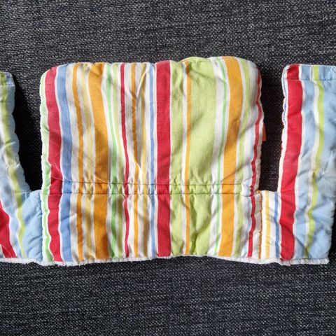 Puuvillaiset pehmusteet Stokken syöttötuoliin. Haalistumaa ja pari tahraa istuinosassa.
