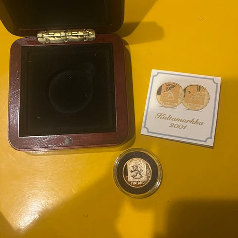 Rahan mukana tulee alkuperäinen kotelo ja aitoustodistus. Ei oo otettu pois pilleristä eli täydellinen kolikko. Kulta on 18 karaatin ja painoa 8,6g. Nouto Tampere. Voidaan myös keskustella postituksesta.