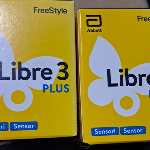 Abbott Libre 3 Plus verensokerianturi (x2), joka on suunniteltu jatkuvaan verensokerin seurantaan.