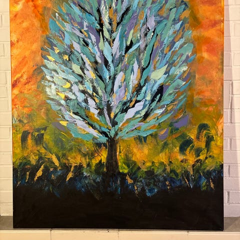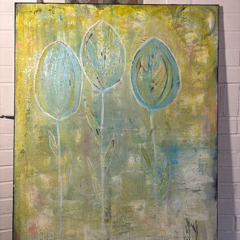 Tyyli on abstrakti, jossa on paksuja maalikerroksia ja näkyviä siveltimenvetoja.