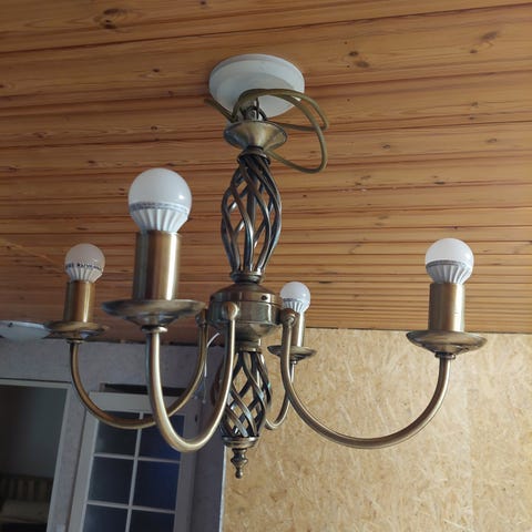 Punainen metallivarjostin, sisäosa valkoista lasia (opaalilasi?). Lasin alareunassa sisäpuolella pieni kirpunpurema, ks kuva.