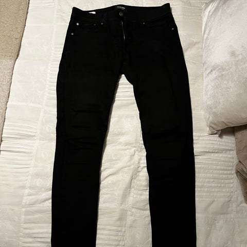 Miesten farkut, tumman harmaat, ei kuitenkaan aivan mustatkaan. Jack&Jones. Kokolappu leikattu, noin L, olleet käytössä hoikalla 185cm miehellä. Tarvittaessa voin kyllä mittailla.