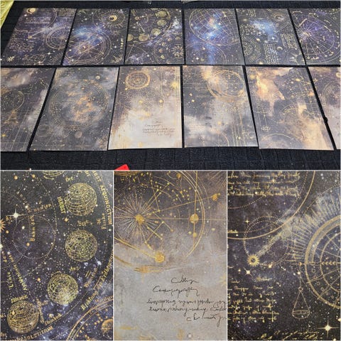 12 kpl uusia vintage henkisiä mattapintaisia papereita erilaisilla tähtitaivas kuvioilla skräppäykseen askarteluun korttien tekoon tai vaikkapa kehyksiin niin saa todella kauniit taulut sisustukseen!